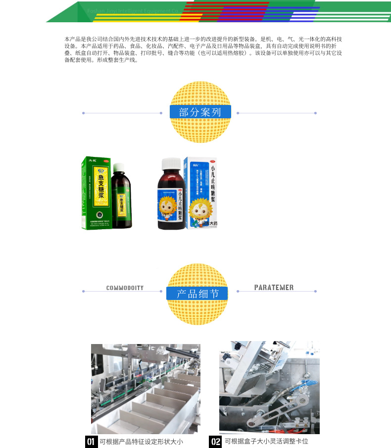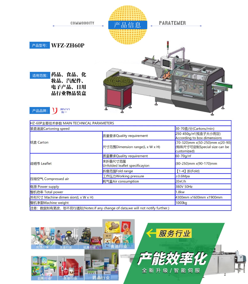 自動化程度 | 全自動 | 適用對象 | 油類,服裝,酸奶,鮮奶,谷物,化妝品類,護發用品,醬類,果汁飲料,碳酸飲料,護膚品類,氣霧劑,酒類飲料,礦泉水、純凈水,清潔、洗滌用品,產品裝托;裝袋;裝盒;裝箱 | 適用行業 | 禮品、工藝品,食品,玩具,日化,煙酒,醫藥,五金、機械,產品裝盒 |
