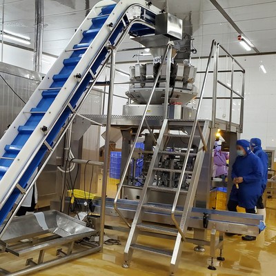 3. 機器清單: ① 振動喂料機 ② 大傾角提升機 ③ 電腦組合秤(10-30頭組合稱均可提供滿足不同需求) ④ 工作平臺 ⑤ 八工位給袋式包裝機 ⑥ 金屬探測器(選購機器 ⑦ 重量選別機(選購機器) ⑧ 圓盤理料機(選購機器) 4. 工作原理 1. 將物料倒入振動喂料機; 2. 物料將通過大傾角提升機提升到電腦組合秤上面加料; 3. 電腦組合秤將根據設定的重量完成自動稱量; 4. 設定重量的物料將掉入給袋式包裝機進行封口包裝; 5. 包裝后的產品將通過成品輸送機進入下一設備(例如,重量選別機,金屬探測器或者圓盤理料機)。