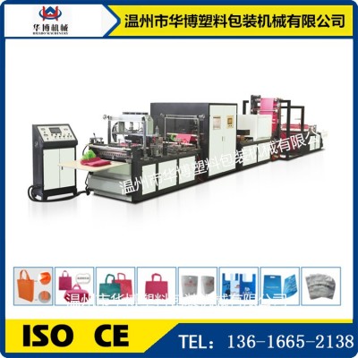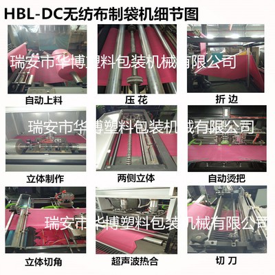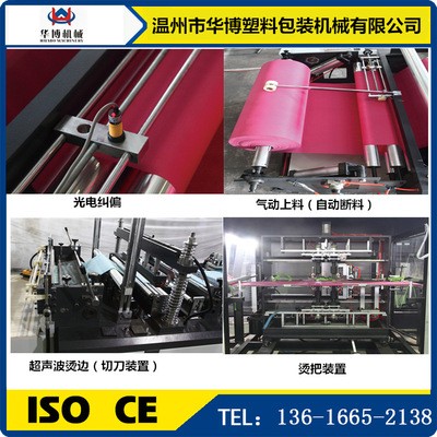 1.該機適用原材料為無紡布,能加工各種不同規格,不同型狀的無紡布穿皮筋袋、穿繩袋、平口袋等,該機集機電為一體,運用LCD觸摸屏操作。配以步進步式定長,光電跟蹤,電腦自動定位,電腦自動糾邊,準確,平穩,自動計數,即可設定計數報警,自動打孔,自動燙把手等工控裝置,使其生產的成品封線牢固,切線美觀。高速效,是你可以放心適用的環保型制袋設備。