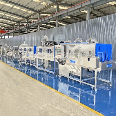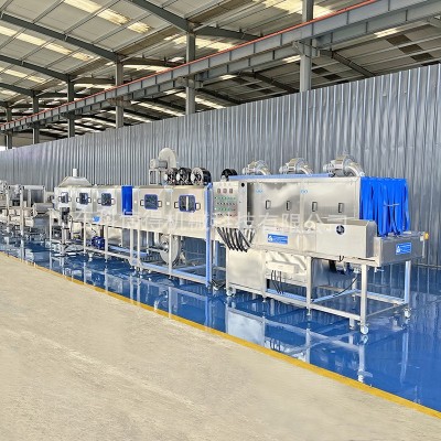 烘干:烘干的作用是利用電熱管(電加熱翅片管)或者蒸汽產生的熱量,通過循環風機去除容器表面的水分,一般用于對容器表面水分較嚴格的用戶,比如汽車配件。電加熱烘干成本比蒸汽成本低,烘干段長度一般為3-6米,該段外表用50mm硅酸鋁保溫材料保溫,降低能耗,為用戶節省成本。